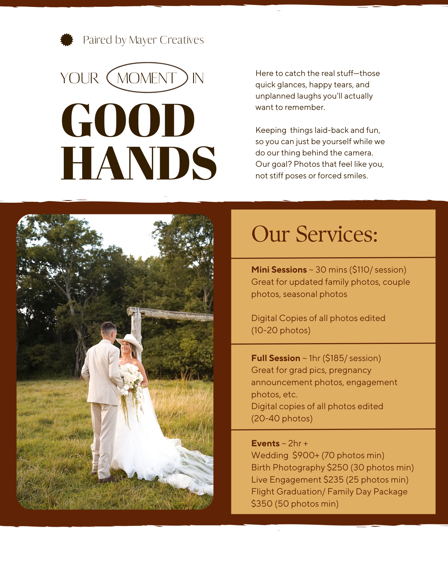 Affordable pricing Payment is due after the session is complete for most services. Weddings require a 10% deposit.